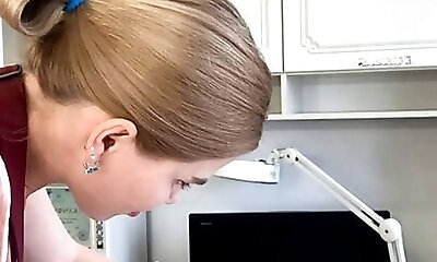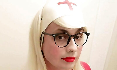 Curly nurse plays with rubber doll and gets banged after