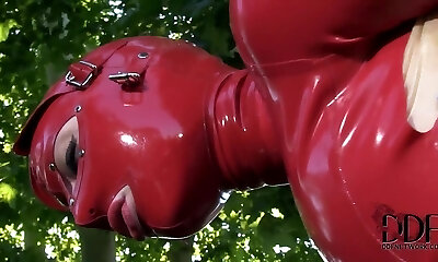 Red XXX frolicking with herself in a latex dress