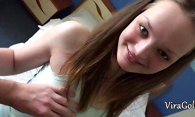高大的青少年安娜Klavkina删除她的内裤和Masturb