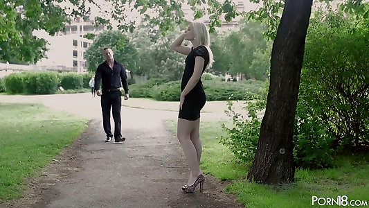Cool blonde in black sundress hooks up with a guy and goes with him