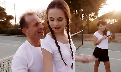 Kinky trainer fucks duo of sexy slim girlies after nice tennis game