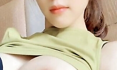 Sweet Asian cute brown-haired on the couch teases herself with wicked fuckfest toys